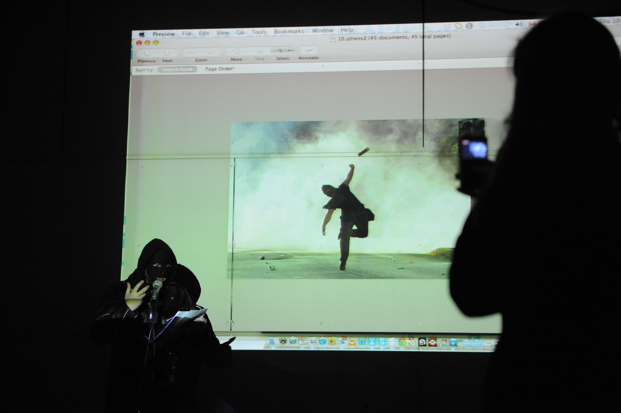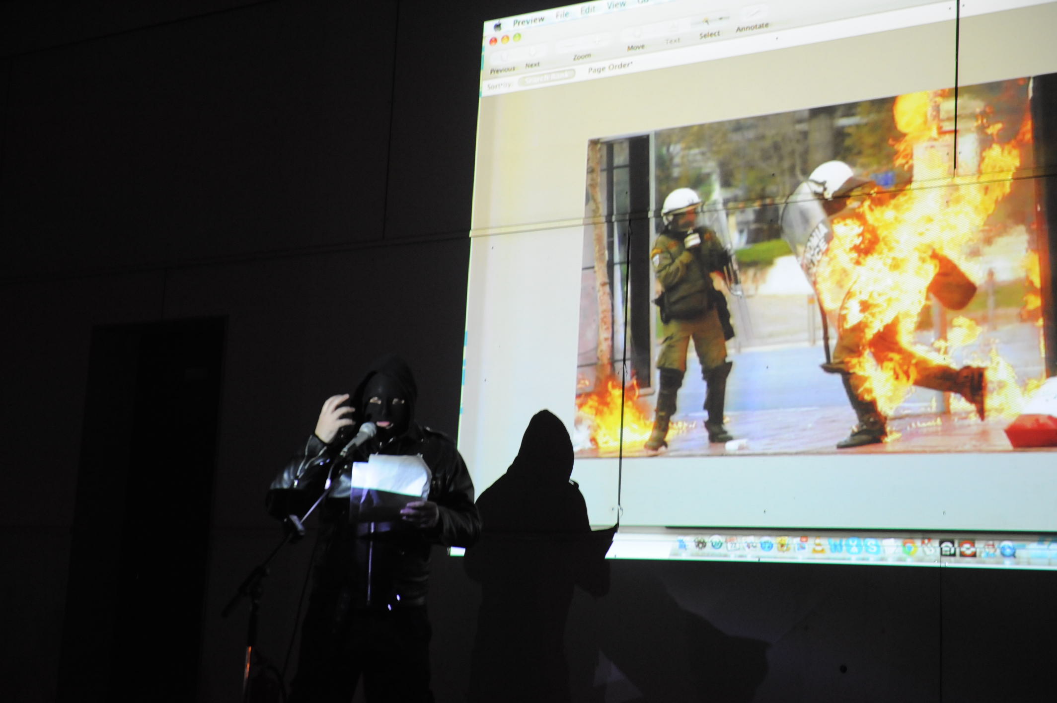 The “Black Circle” project was first presented in May 2010. The project shows a series of aggressive and esoteric speeches based on the study of groups belonging to the trend of Third-positionism (Autonomous Nationalism, National Anarchism, National Bolshevism, Radical Traditionalism). Groups of this peculiar trend exist in Greece since the 90s. They are early splits of the Golden Dawn neo-Nazi movement. Since 2008, some of these kernels tried to influence parts of the youth. Most notorious are the “Black Lilly” and the “Independent Meandrian Nationalists”. Through studying the rhetoric of the Black Lilly group, KavecS (Kostis Stafylakis & Vana Kostayola) crafted the Black Circle: a mimetic reproduction of this strange ideological amalgam of anticapitalism, ethno-communitarianism and love for the medieval society. Different versions of the Black Circle have been presented in Athens (aaart, XYZ Outlet et.al.), at the 4th Moscow Biennial (Media Impact Show), at the “Truth is Concrete” marathon of activist art (Graz), at Palais de Tokyo (“Hell as Pavilion” show) and elsewhere.