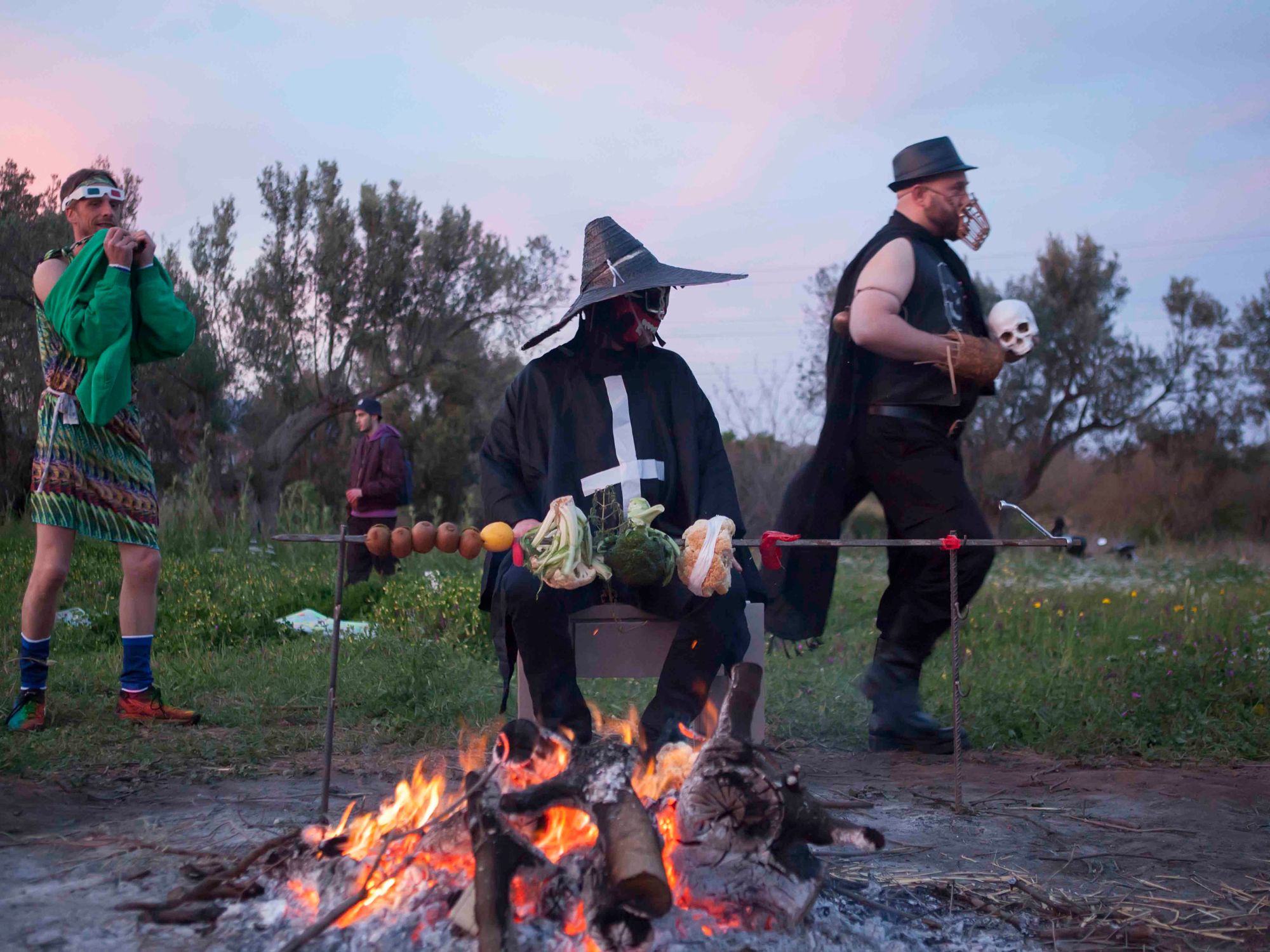 The final destination was the most unexpected one. The bus reached a rural area, with some agricultural structures, small family industries and houses – a kind of no man’s land. The bus suddenly stopped. The narrow street was blocked by a dark figure sitting on a sofa. A Mexican Satanist, an Indian, a pink gorilla and two kids blowing a musical organ entered the bus and made irritating noise. The bus driver and the guide explained that the bus cannot proceed further. The group debarked and followed the strangers. Walking through a rural area, they soon reached an open field hosting a small village. The tents were inhabited by this strange community of excited locals. The Mexican Satanist and the Indian were roasting vegetables. A teacher was delivering drawing lessons. An ominous dark figure holding a skull came out of its tent and prepared to attack. A tennis coach delivered loud orders. The female “head of the tribe” welcomed the visitors and asked them to sit around her. She started saying stories about a community of autochthonous people that used to inhabit various locations in Attica. According to the story, the people on the field are the progeny of and the indigenous athenian community of the Atticani. According to her story, the Atticani decided to abandon their land in the center of Athens, in early 20th century, when Athens started being urbanized and industrialized. They realized their own exodus towards the rural suburbs in order to “maintain their traditional lifestyle and values.” Two blind twins were singing local songs and presented photos of their ancestors and their original land’s.
