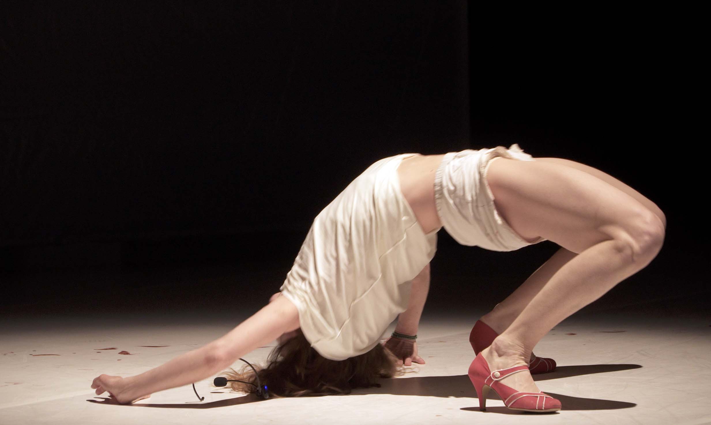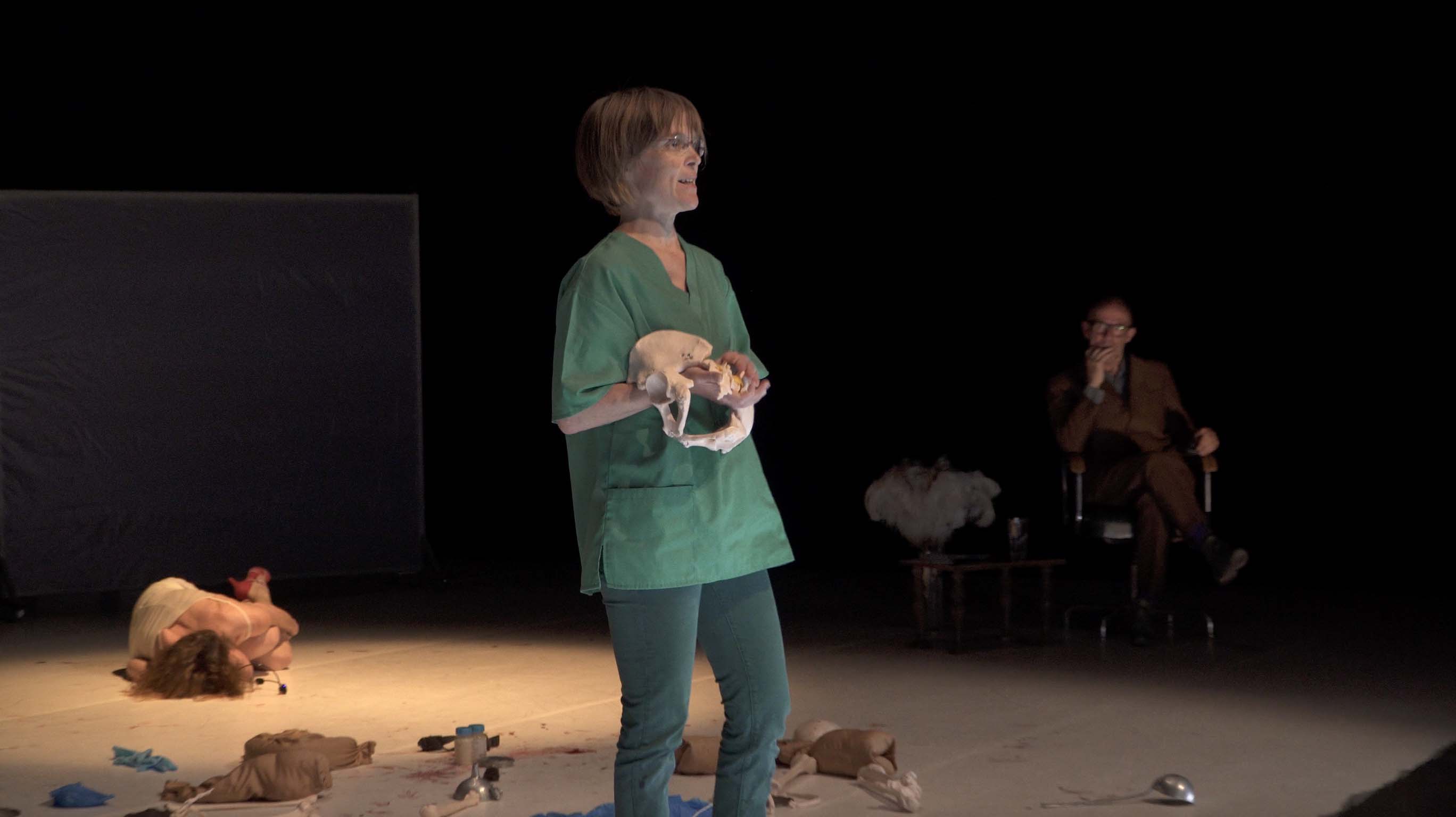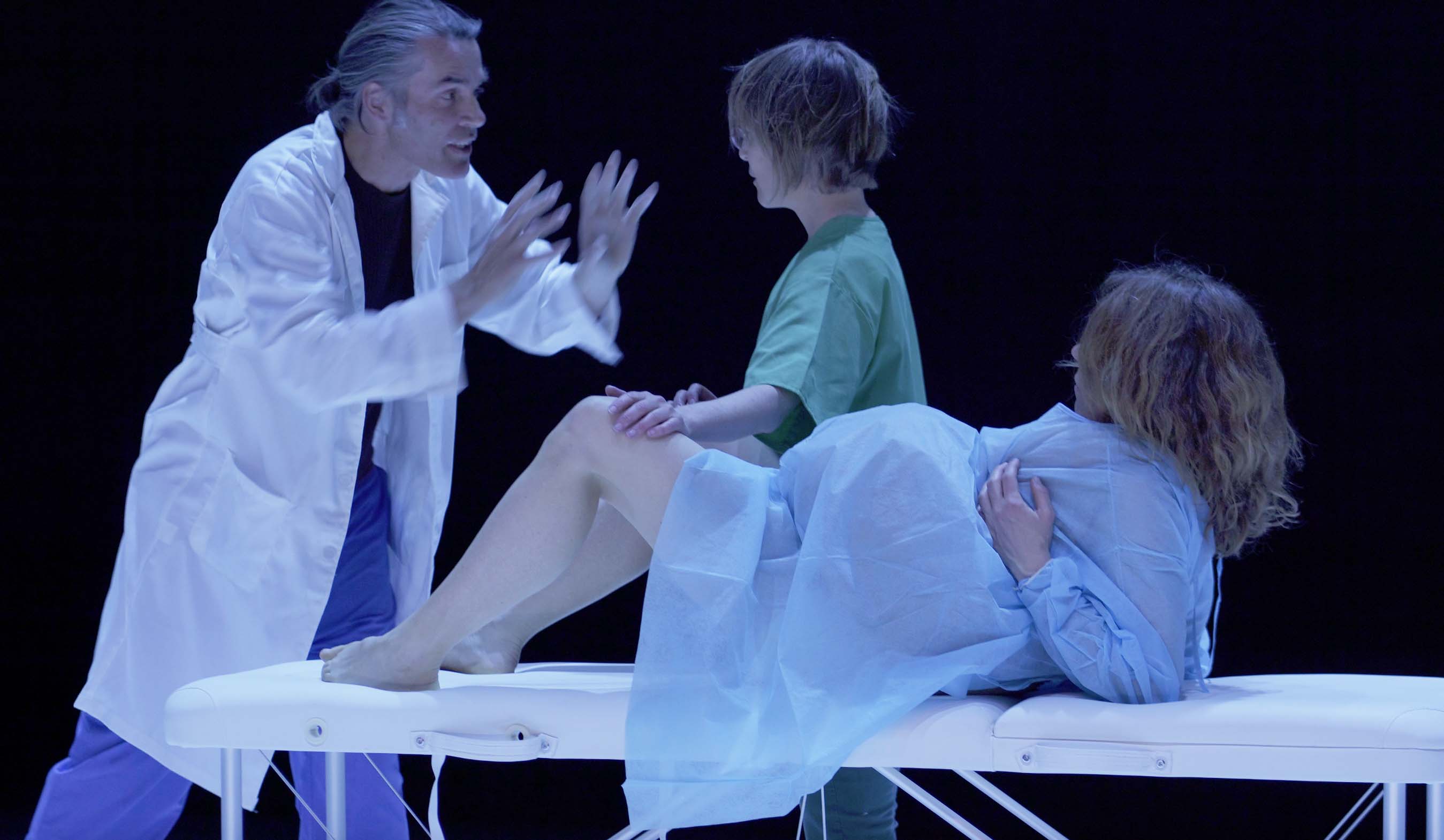 “C’est pour ton bien” dit le gynécologue à la femme enceinte tandis que la scène devient progressivement rouge à cause du sang des règles d’une autre femme qui se balade tout au long de la performance.