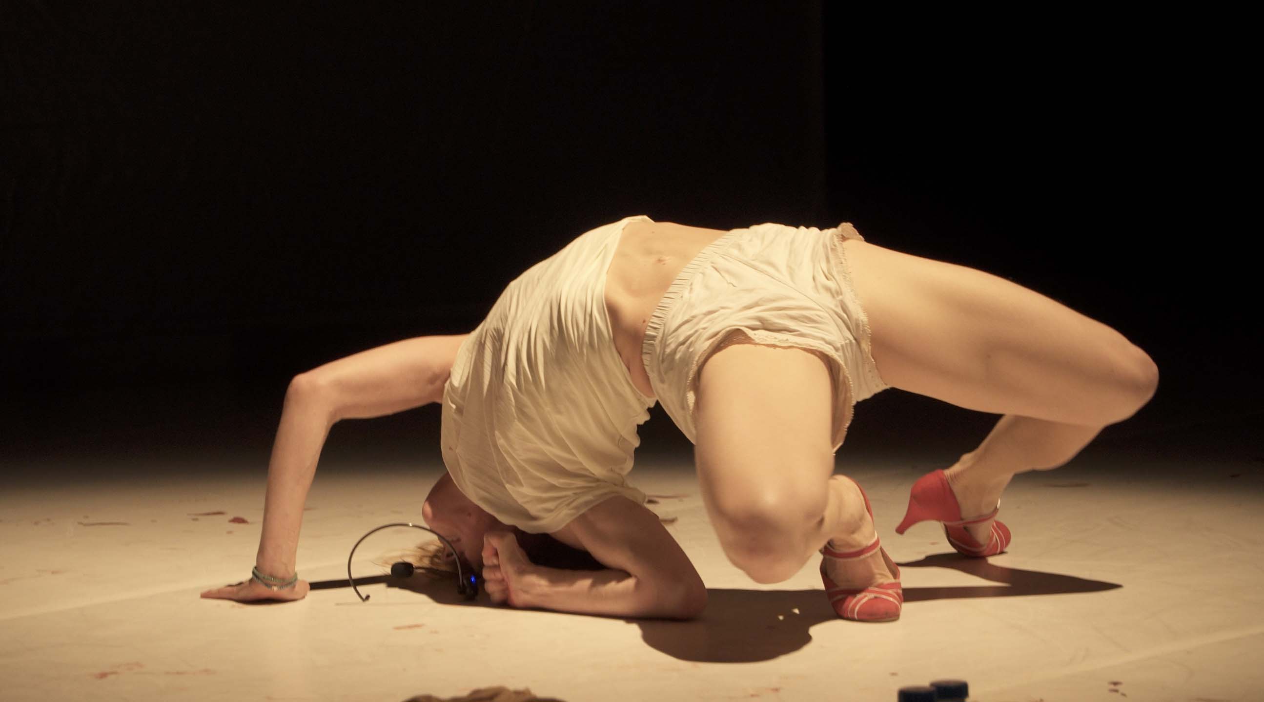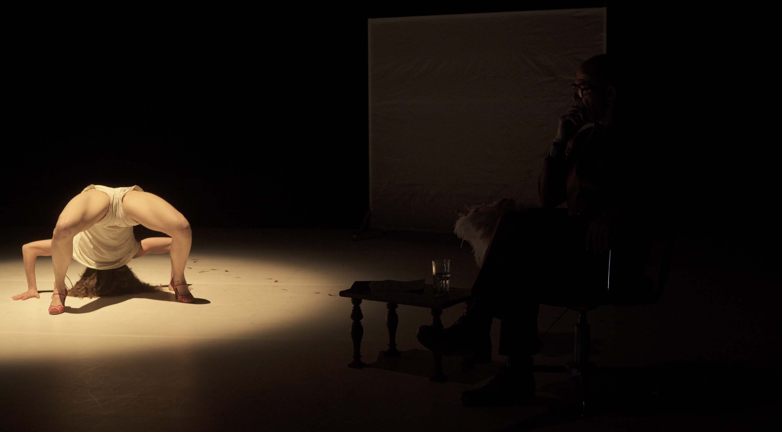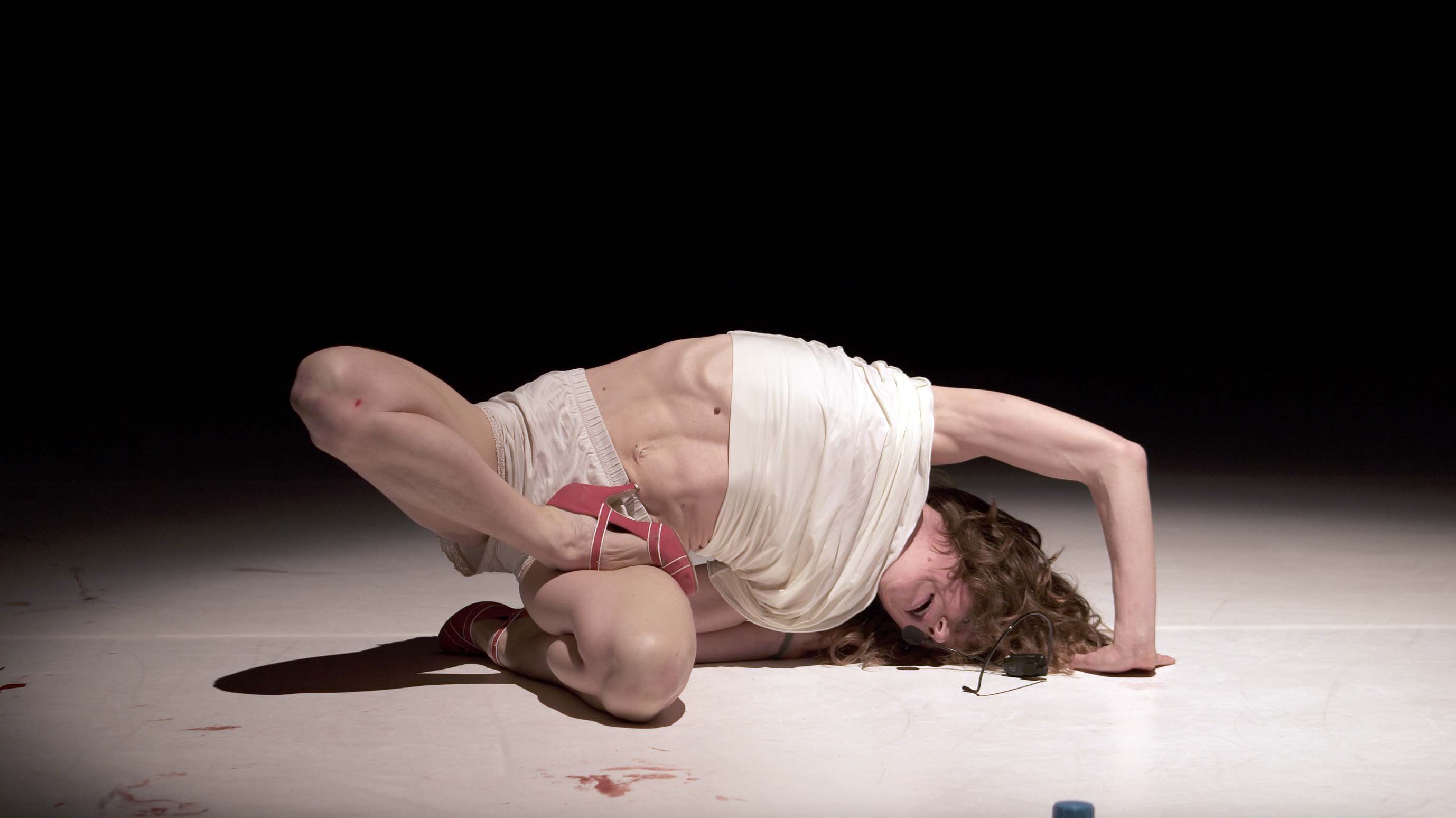 “C’est pour ton bien” dit le gynécologue à la femme enceinte tandis que la scène devient progressivement rouge à cause du sang des règles d’une autre femme qui se balade tout au long de la performance.