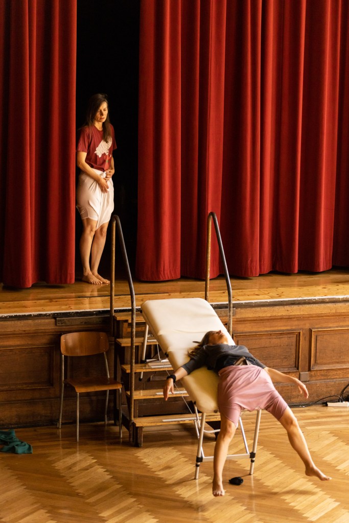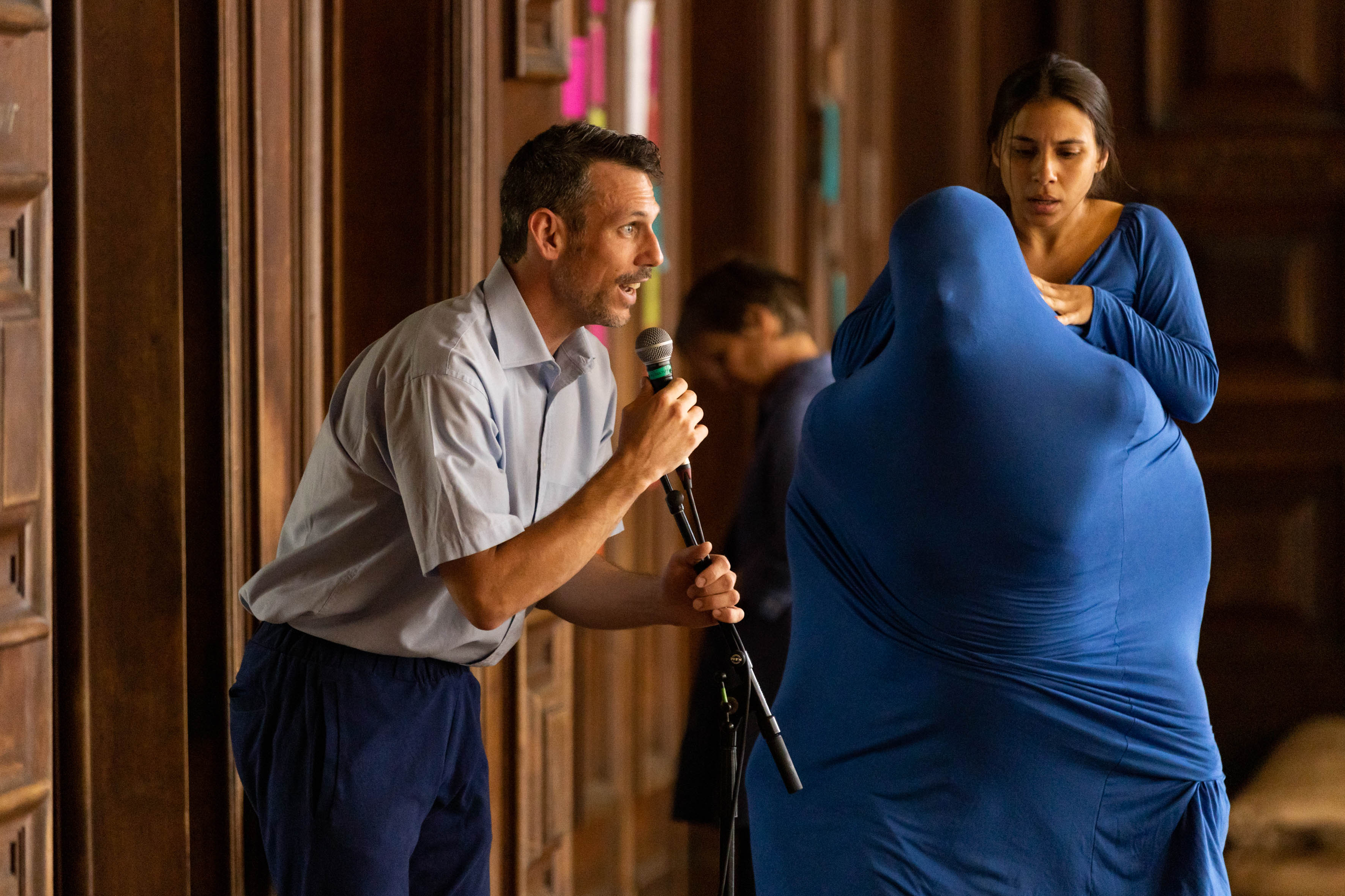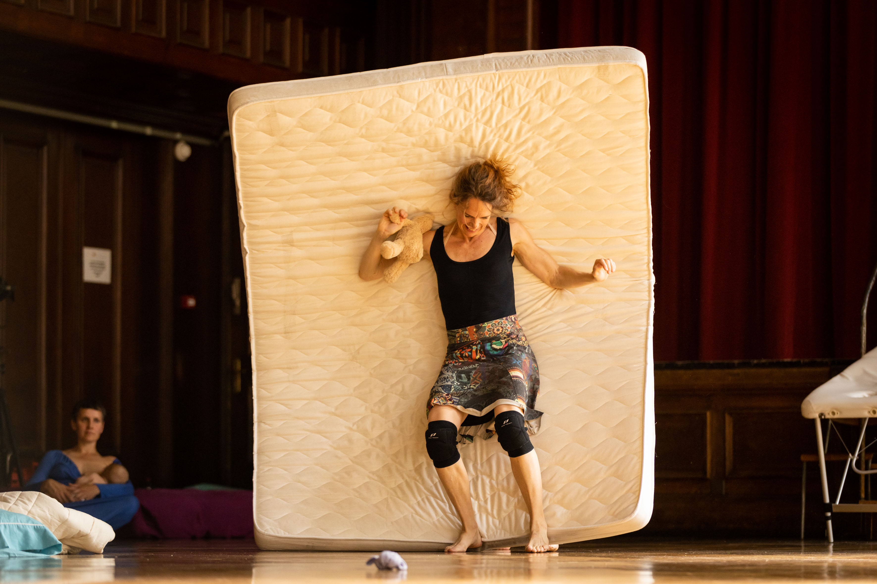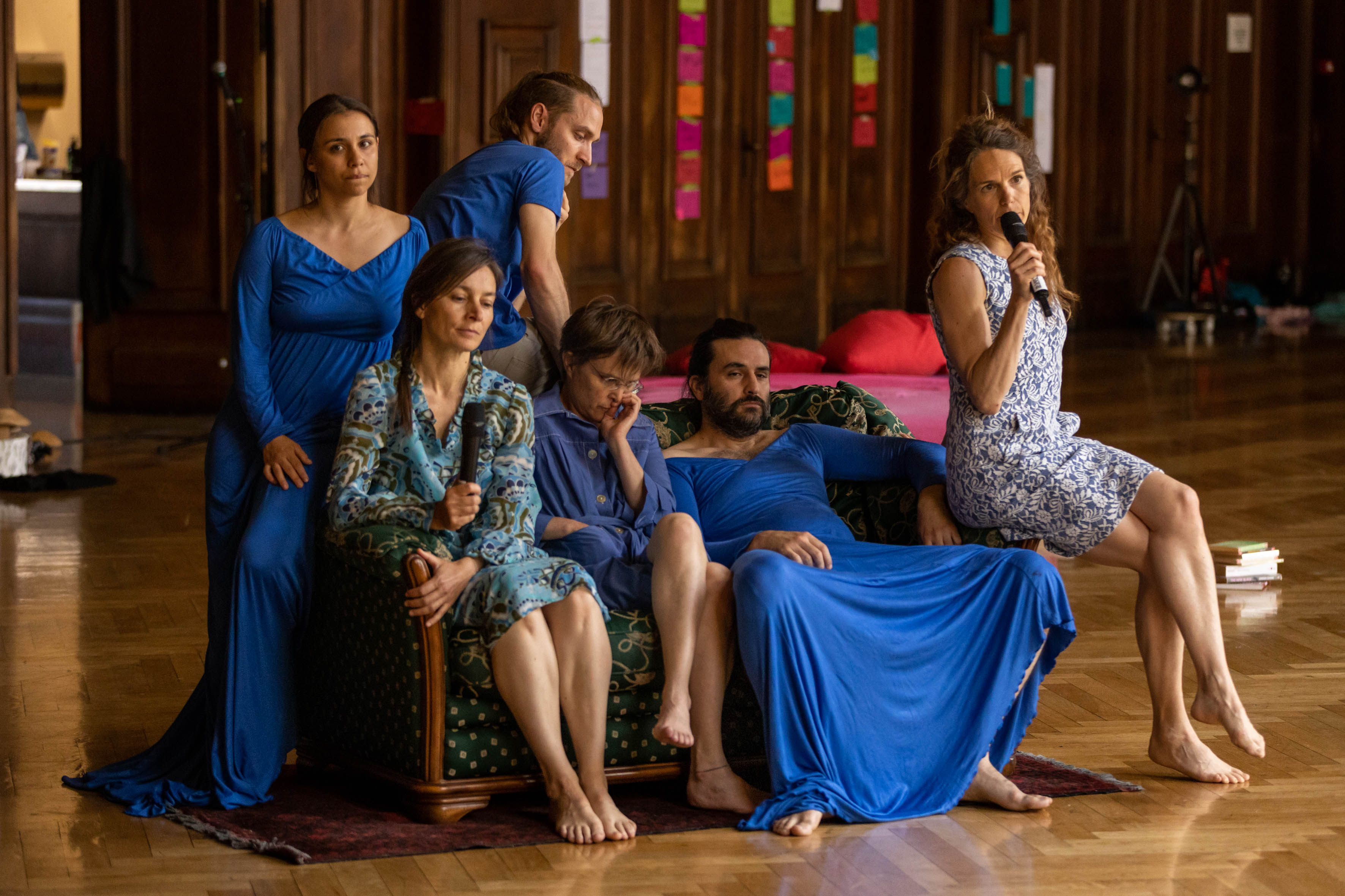 The protagonist on stage is Marie and she is plural. It is played by different performers, men and women. While the presenter announces the coming of each Mary as if it were a symptom of a contemporary discourse, the new Mary unfolds. Sometimes Marie is a control freak, sometimes she’s a melancholic or simply not available, just absent. While Marie appears divine, we also see her on her therapist’s couch: her diagnosis will soon be visible, in theory and practice. Mary also embodies the figure of the mother, but it is to better ask us what relational bodies the maternal is made of today. Mary here, Mary there. The performers move back and forth, in and out of their roles to explore the playful and dark sides of Marie. Its different figures, alternately victims and aggressors, are freely improvised and explored by playing on the threads of the news. In interaction with the wandering audience, our bodies and voices perform movements, fabricate objects and shape narratives that narrate, abuse and transform the multiple facets of representations of Mary.