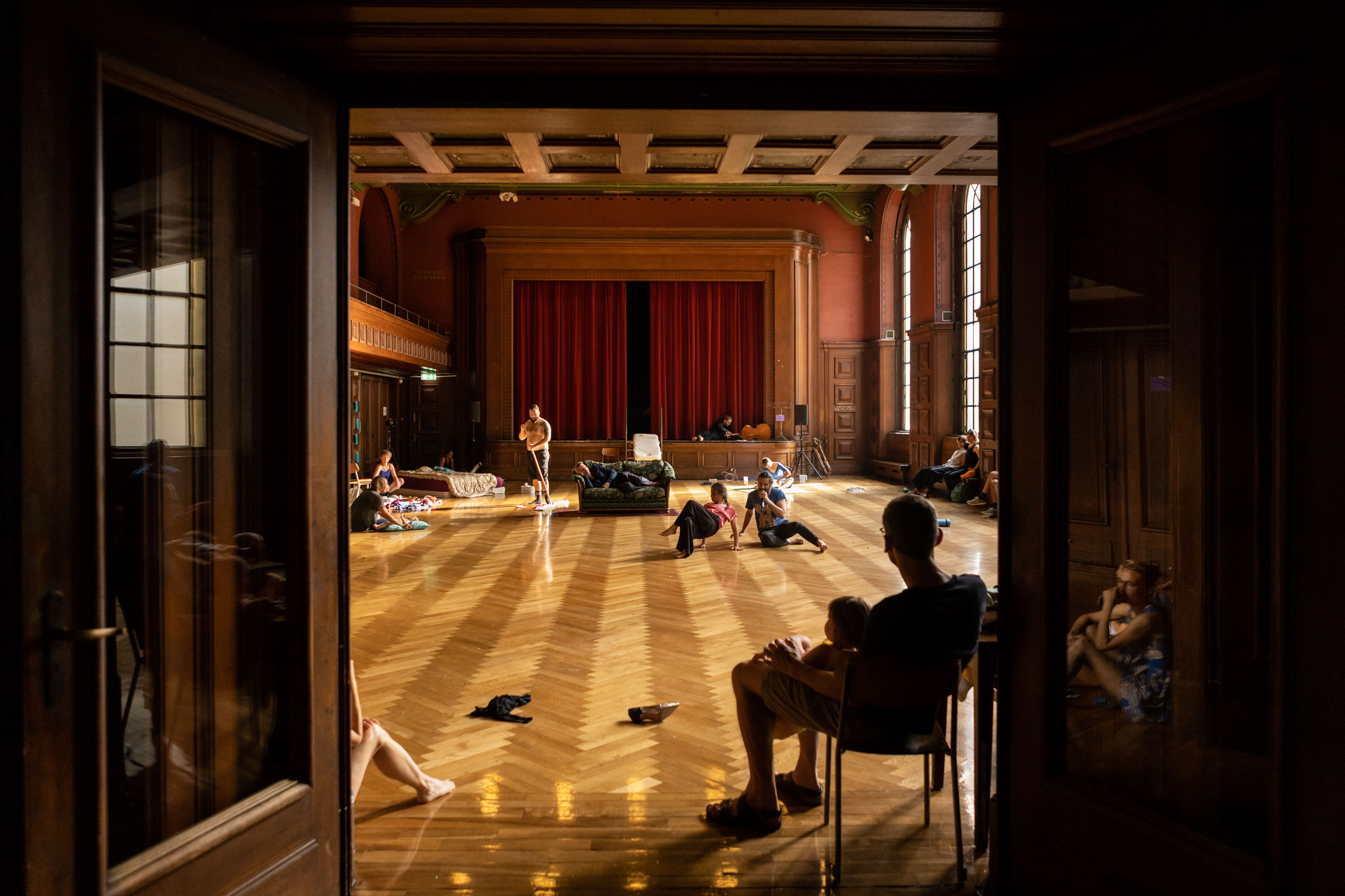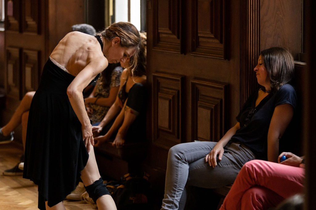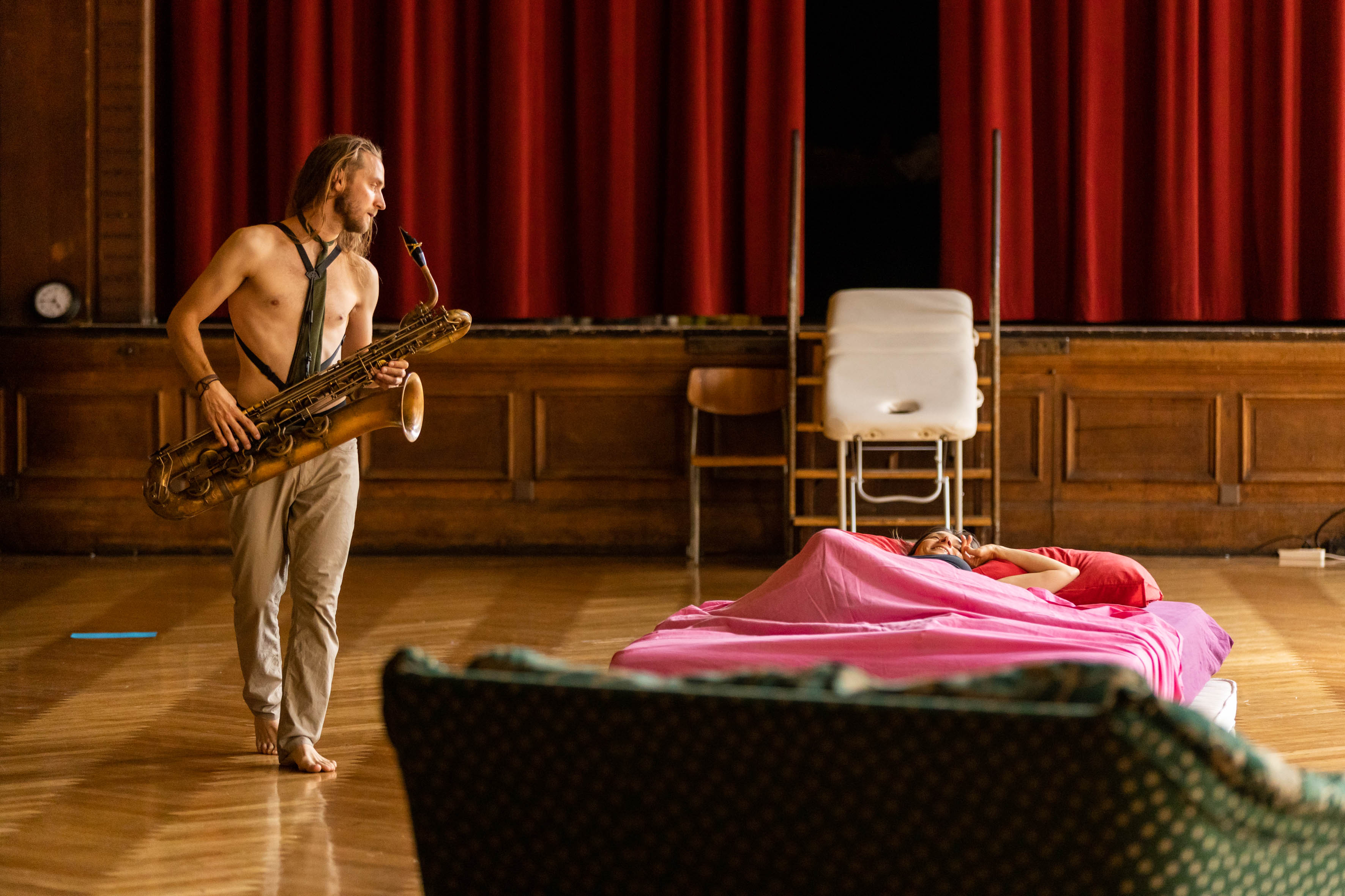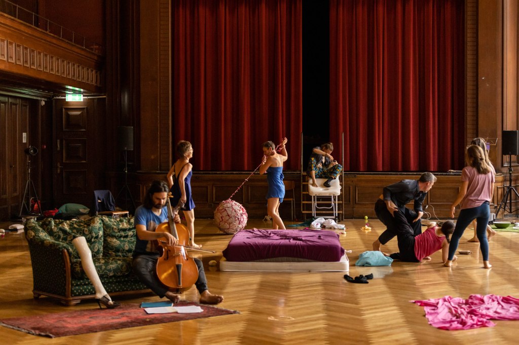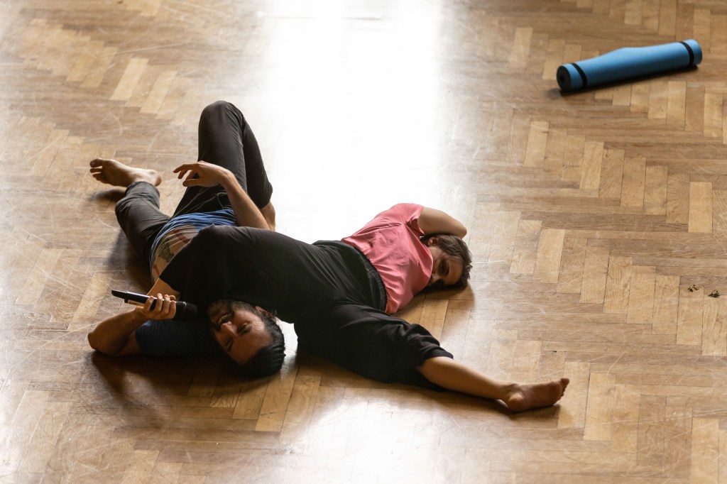 The protagonist on stage is Marie and she is plural. It is played by different performers, men and women. While the presenter announces the coming of each Mary as if it were a symptom of a contemporary discourse, the new Mary unfolds. Sometimes Marie is a control freak, sometimes she’s a melancholic or simply not available, just absent. While Marie appears divine, we also see her on her therapist’s couch: her diagnosis will soon be visible, in theory and practice. Mary also embodies the figure of the mother, but it is to better ask us what relational bodies the maternal is made of today. Mary here, Mary there. The performers move back and forth, in and out of their roles to explore the playful and dark sides of Marie. Its different figures, alternately victims and aggressors, are freely improvised and explored by playing on the threads of the news. In interaction with the wandering audience, our bodies and voices perform movements, fabricate objects and shape narratives that narrate, abuse and transform the multiple facets of representations of Mary.