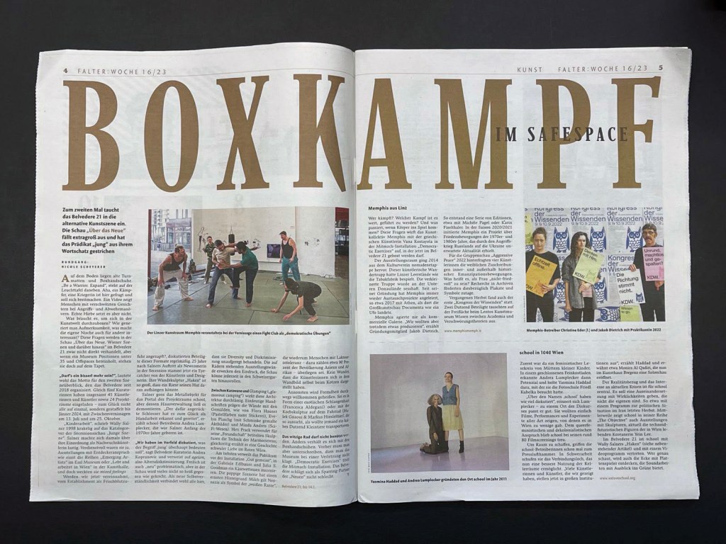 The second version of “Democratic Exercises – Body at Risk” was produced for the exhibition ” On the New, Viennese Scenes and Beyond – Part 1″, at Belvedere21 in Vienna.