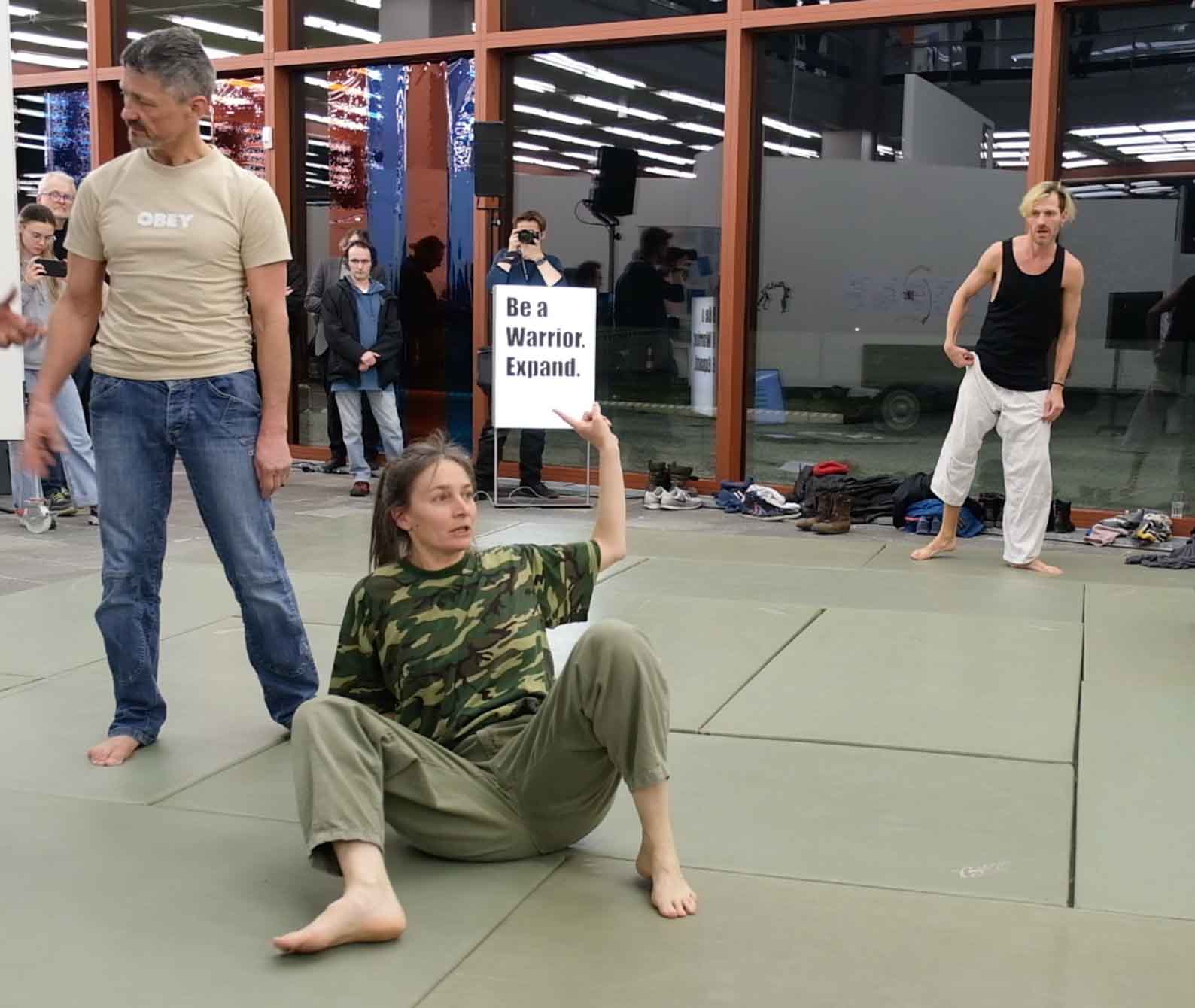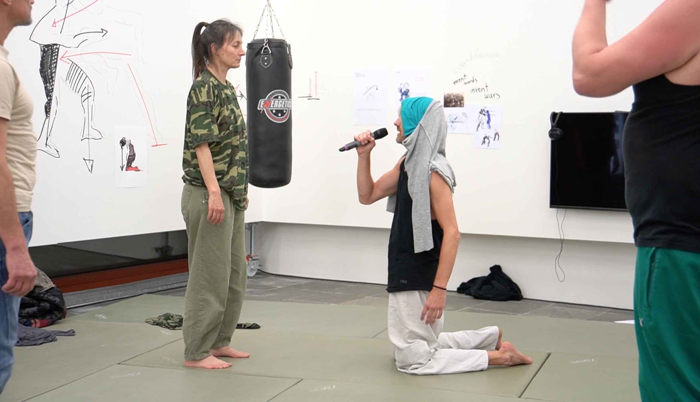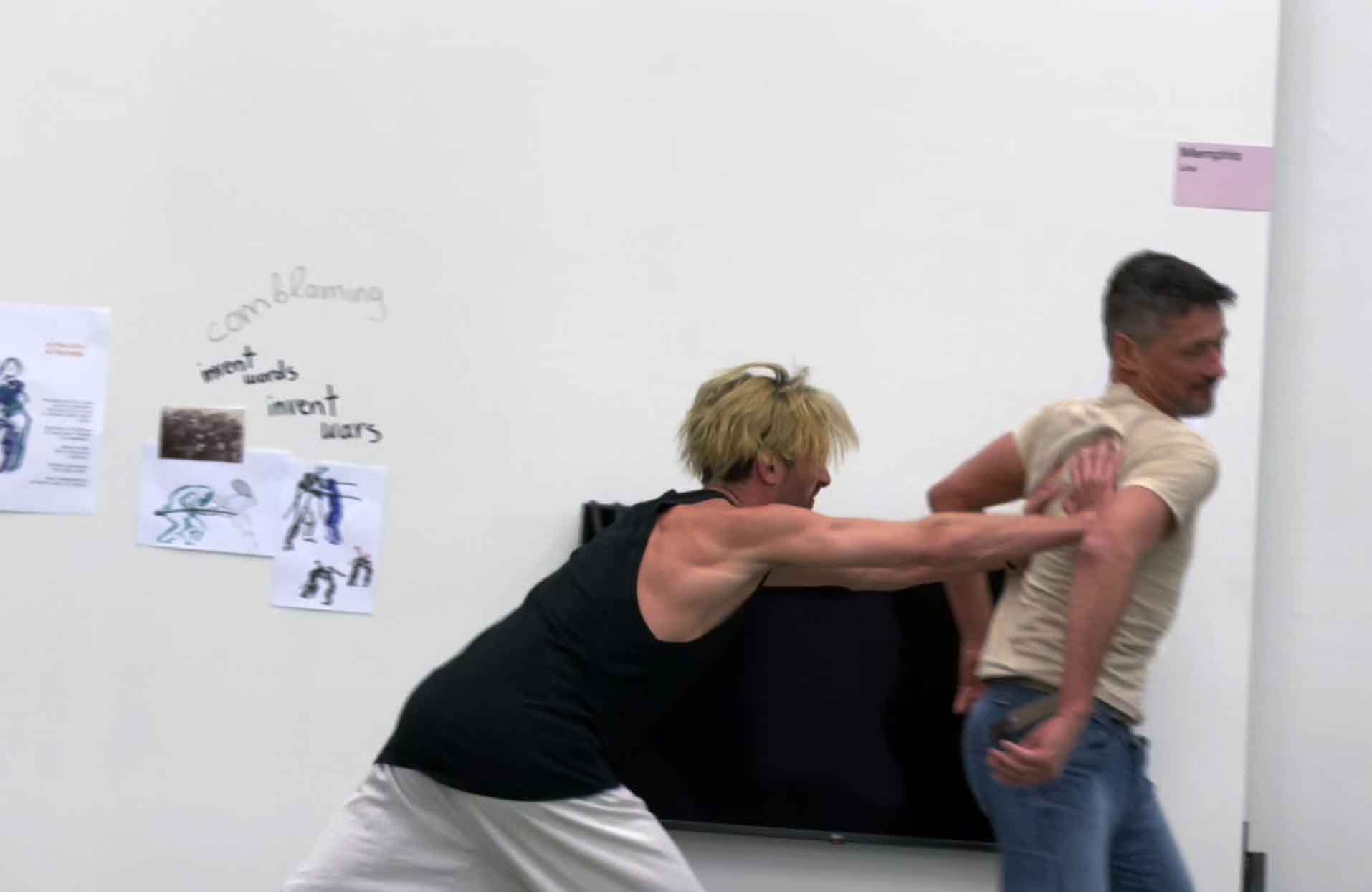 Collective apologies, a Care Giver asking “Do you love me?”, the need for a good Psy, scenarios of climate apocalypse and accusations of “still eating meat?!” are some of the issues around the fighting exercises. “Toxic masculinity” and questions as “Are you a man or a woman?” return to give space for more “insults” and “verbal aggression”. Who is the victim? How we produce victims and aggressors ?