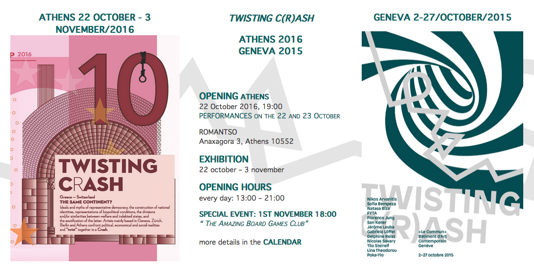 Well, Twisting C(r)ash focuses on the failures of this narrative – the failures of art’s humanist self-understanding as a remedy for today’s malaise. The works presented in the show emerge out of a reluctance to speak for the desperate, the unprivileged, the dispossessed, the People, the Multitude, the Nation – all the categories and agencies that have been pivoted to express and represent various recent collective subjectivities and social mobilizations. To disrupt this hypertrophic “artistic privilege”, the 12 artists/art teams of the show (7 Swiss and 7 Greek) have been given a scenario – the hypothesis of a “reversed reality”: The Swiss banking System collapses, rogue Swiss political parties demolish all bridges to existing Europe while Greece becomes a rich suburb of the European Continent, divided in cantons. In addition, referendums become a political routine in Greece’s social life. The perfect catastrophe! Actually, one can easily recognize signs of this superficial reversal in today’s state of things. Hypothetical experiments tend to be exceeded by reality.